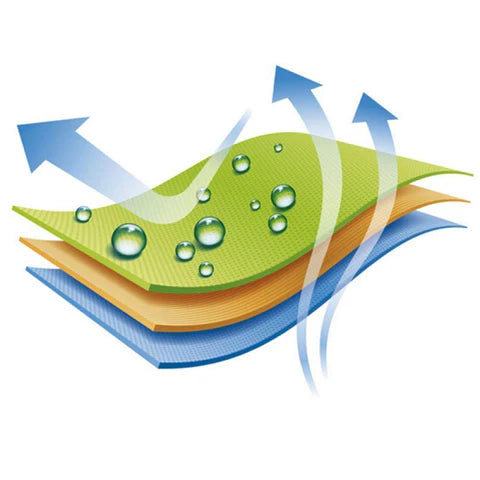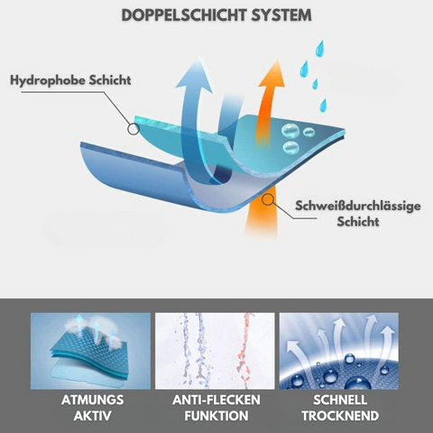 Ganz einfach: Der speziell entwickelte Stoff ist mit hydrophoben "Mikrolöchern" konstruiert, die eng genug sind, um Flüssigkeiten abzuweisen, aber gleichzeitig genug Luft durchlassen, um maximalen Komfort und Atmungsaktivität zu gewährleisten, im Grunde wie ein Sporttrikot, nur besser.