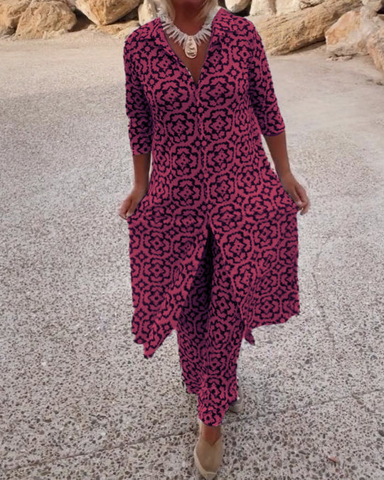 Sarmaine™ ist ein aufeinander abgestimmtes Set, bestehend aus einem Oberteil und einer passenden Hose im gleichen Muster. Das Oberteil verfügt über eine praktische Knopfleiste an der Vorderseite und Ärmel, die bis kurz unter den Ellbogen reichen. Die Vorderseite fällt in zwei Teilen locker über die Hose, was besonders bei Bewegung ein angenehmes Tragegefühl vermittelt. Die Hose ist mit geraden Beinen geschnitten und sitzt perfekt, ohne einzuengen. Das gesamte Set fühlt sich wunderbar sanft auf der Haut an.